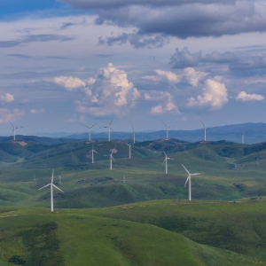 这是8月17日拍摄的内蒙古通辽市霍林郭勒锦联新能源有限公司风电场(无人机照片)。
