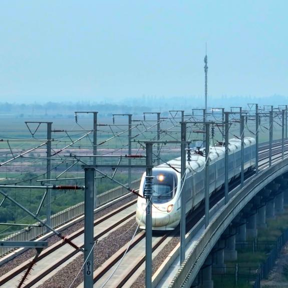 8月15日,进行测试的动车组列车行驶在石嘴山特大桥上(视频截图)。