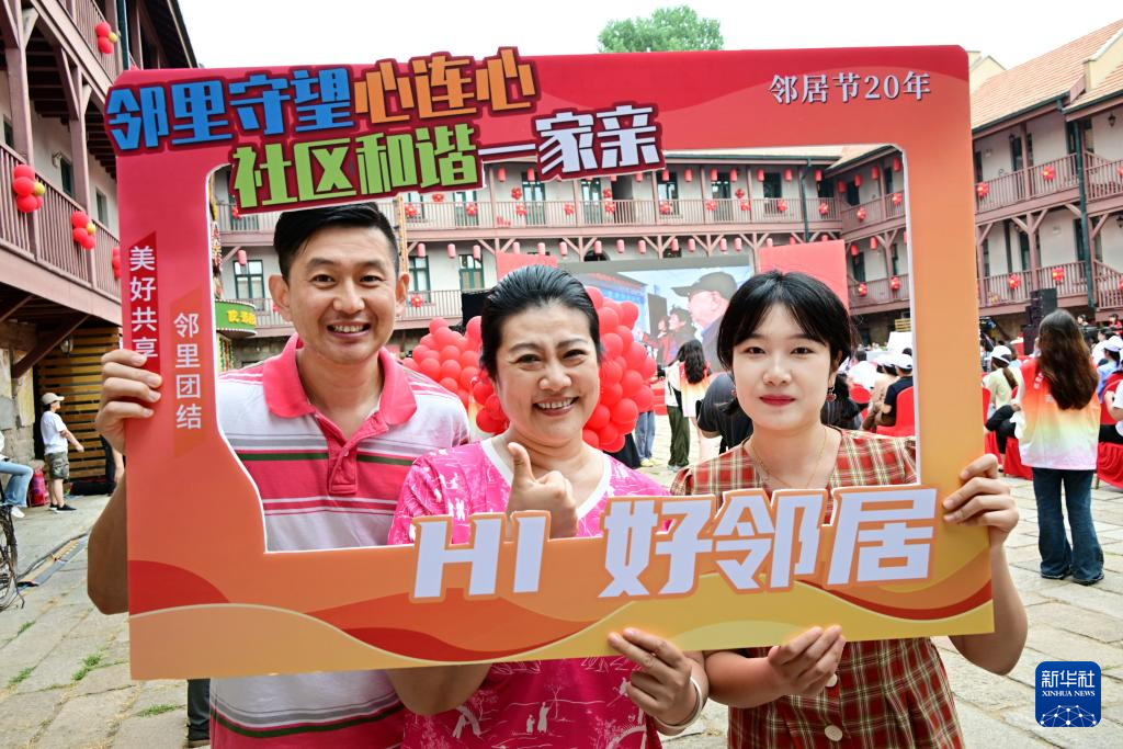 市民在青岛邻居节20周年系列活动启动仪式上合影(6月17日摄)。