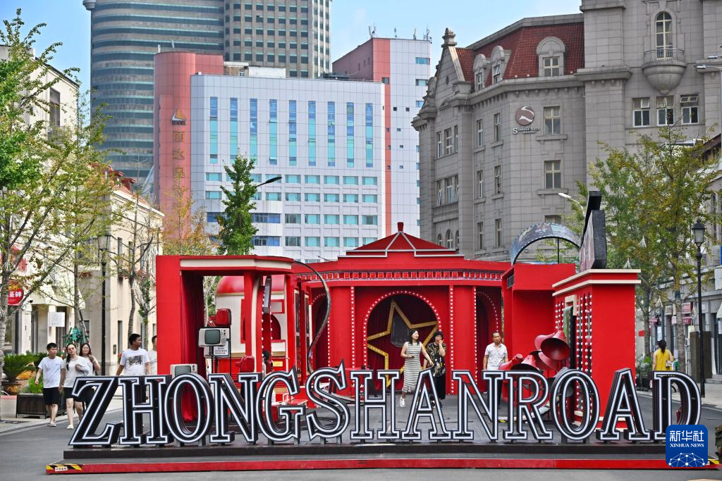 人们在青岛市南区中山路上游玩(8月17日摄)。