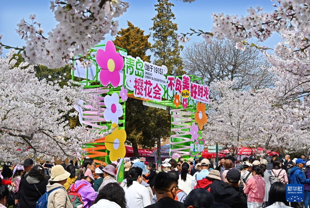 人们在青岛中山公园观赏樱花(4月11日摄)。