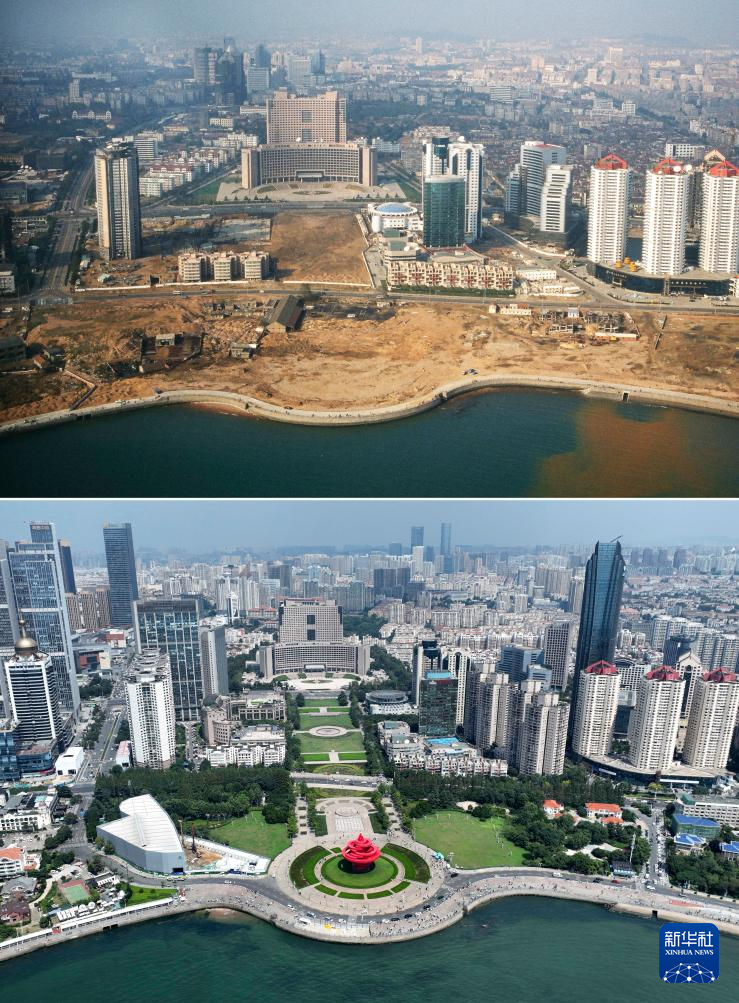 这是一张拼版照片。上图为1996年拍摄的建设中的青岛五四广场(青岛市委宣传部供图),下图为鸟瞰青岛五四广场景色(8月17日新华社记者李紫恒摄,无人机照片)。