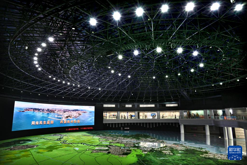 人们在青岛城市展览馆内参观(8月17日摄,无人机照片)。