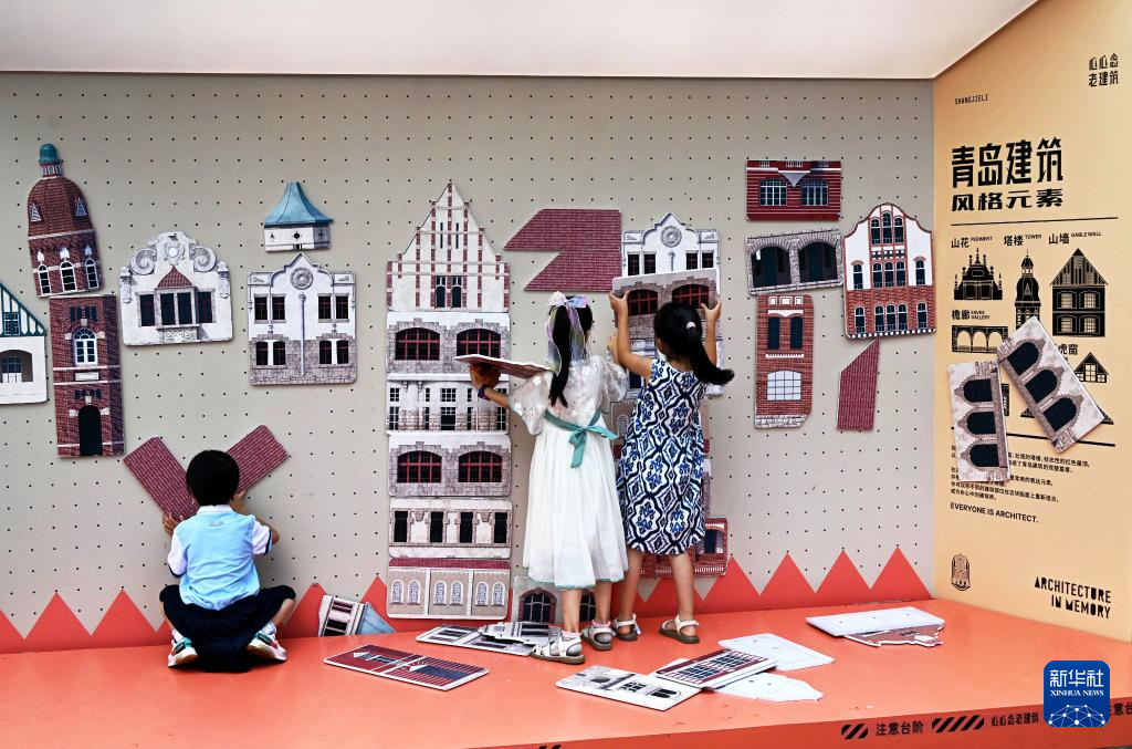 几名小朋友在青岛市南区中山路一街头文化亭内玩耍(8月17日摄)。