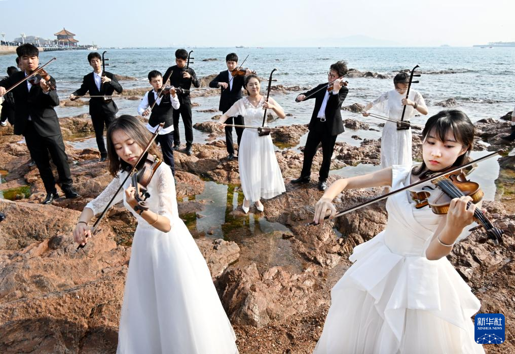 中国海洋大学艺术系学生在青岛市市南区栈桥景区演奏(4月18日摄)。