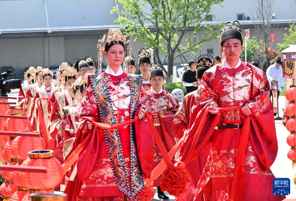 新人在青岛市崂山区新时代文明实践广场参加集体婚礼(5月9日摄)。