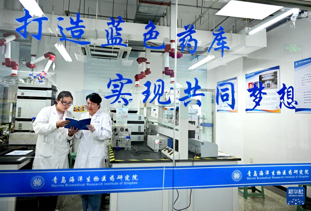 青岛海洋生物医药研究院两名科研人员在实验室交流(6月7日摄)。