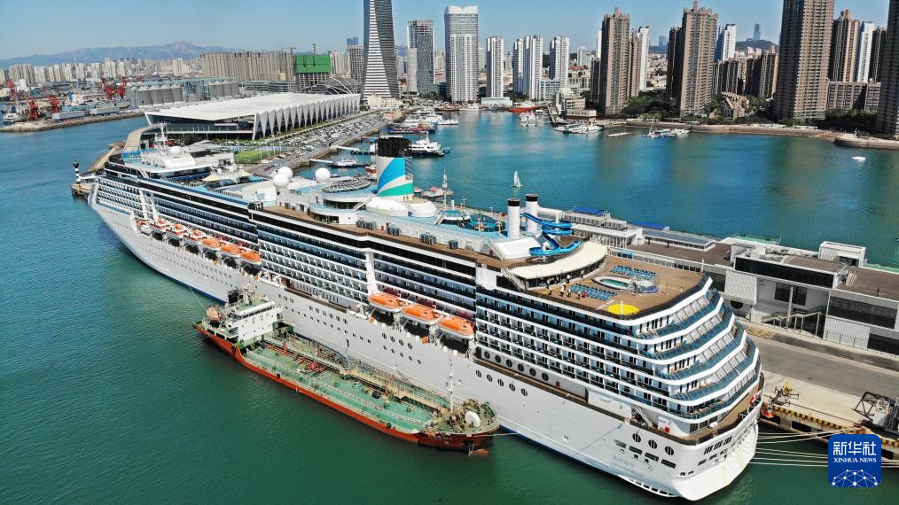 巴哈马籍“爱达·地中海”号邮轮靠泊山东青岛国际邮轮母港(6月27日摄,无人机照片)。