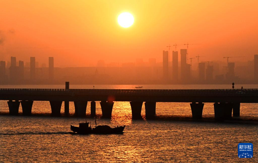 渔船在晨光中从青岛胶州湾跨海大桥旁驶过(1月1日摄)。