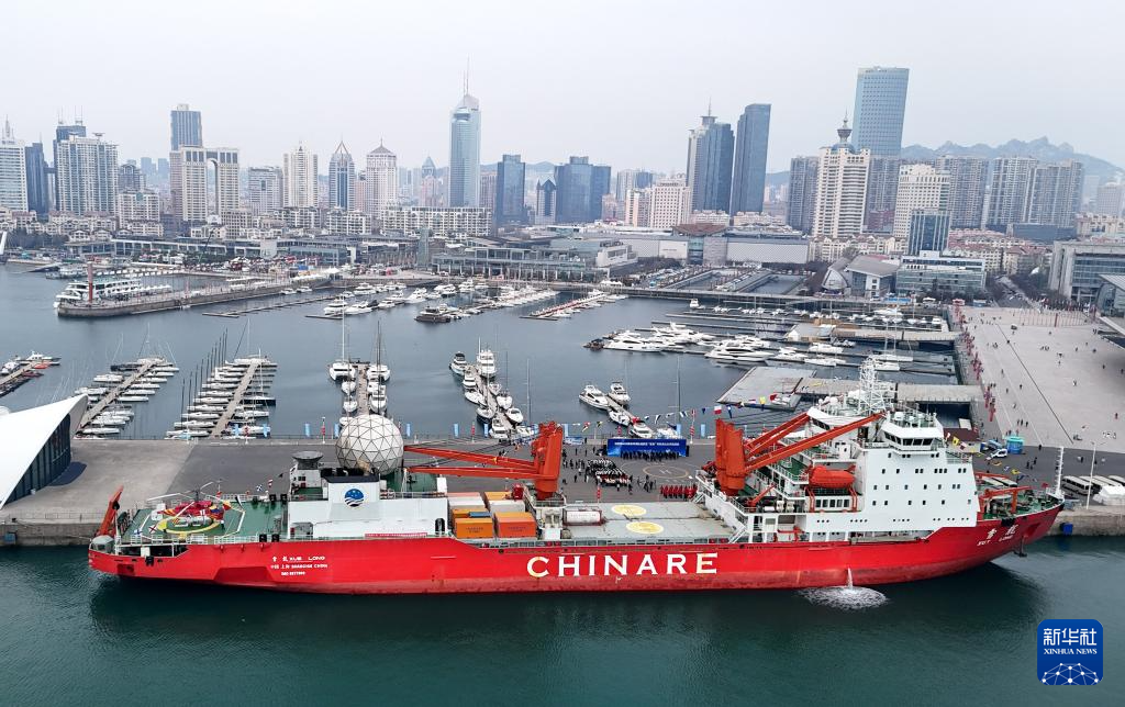 “雪龙”号极地考察船停靠青岛奥帆基地码头(4月10日摄,无人机照片)。