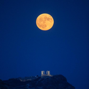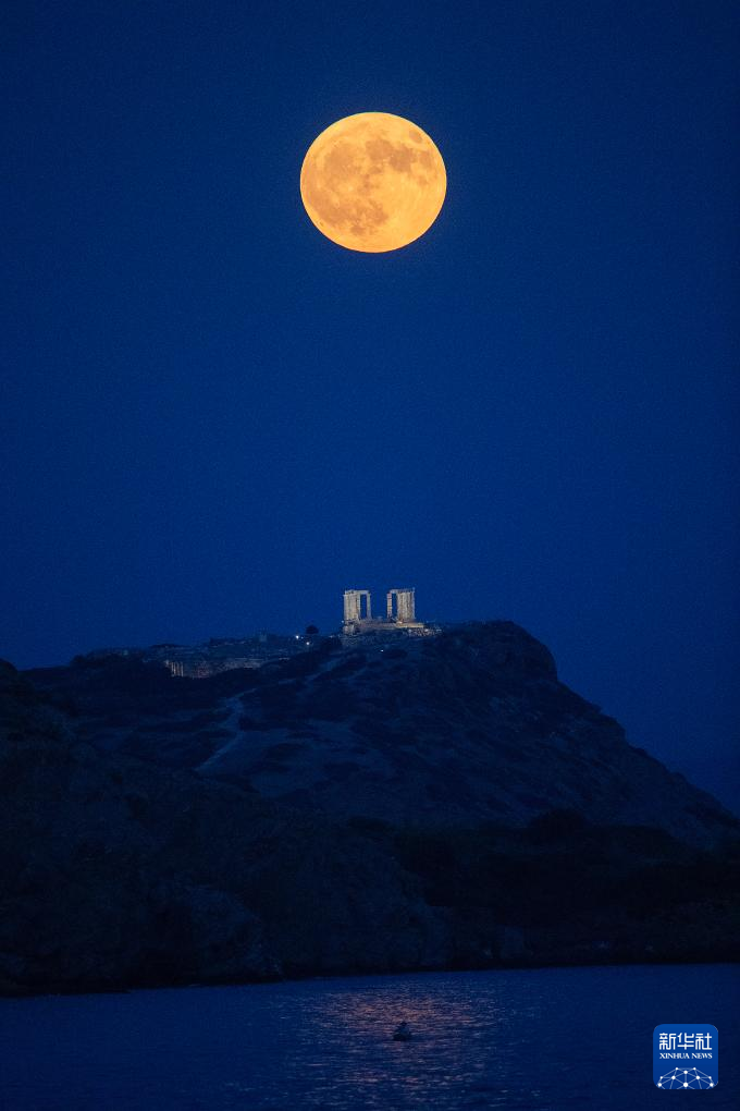 这是8月19日在希腊雅典附近苏尼翁角拍摄的波塞冬神庙上空的月亮。