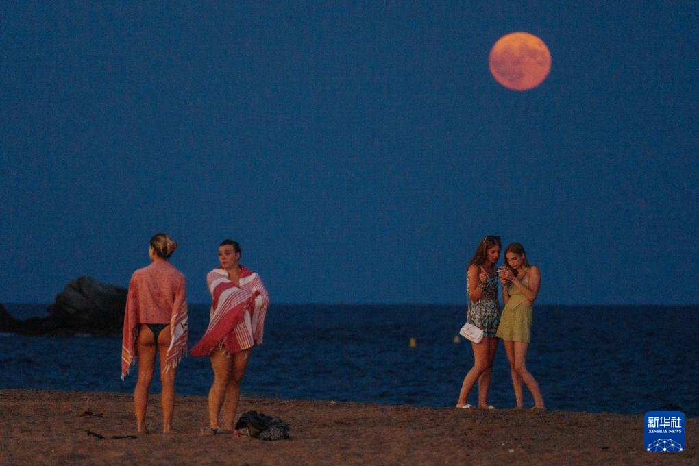 8月19日晚,人们在西班牙巴塞罗那附近海滩观赏月亮。