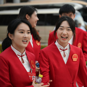 8月20日,射击运动员黄雨婷(前右)和跳水队教练陈若琳(前左)在总结大会后离场。