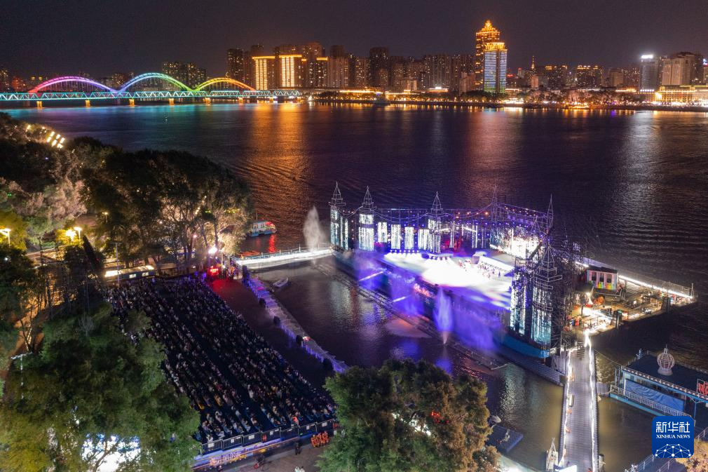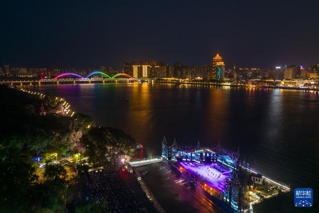6月10日,演职人员在《遇见·哈尔滨》江上沉浸式演艺现场进行表演(无人机照片)。
