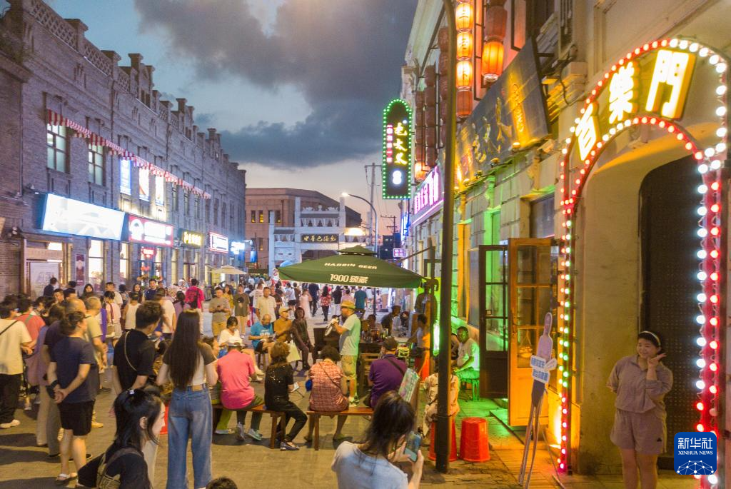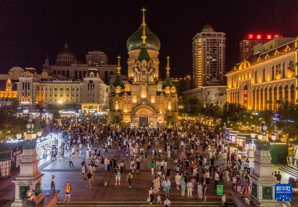 8月16日,人们在哈尔滨中华巴洛克历史文化街区游览(无人机照片)。