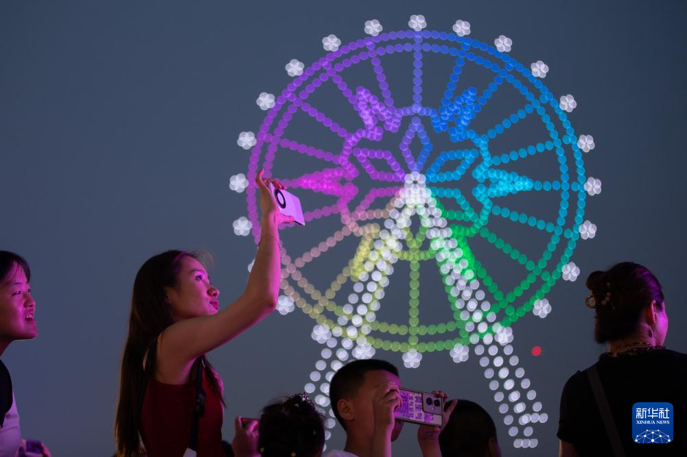 7月6日,人们在哈尔滨国际啤酒节现场观看无人机表演(无人机照片)。