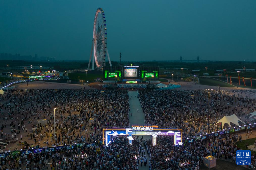 7月6日,人们在哈尔滨国际啤酒节现场观看无人机表演。