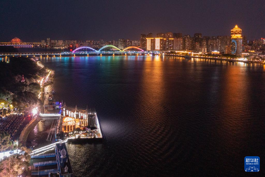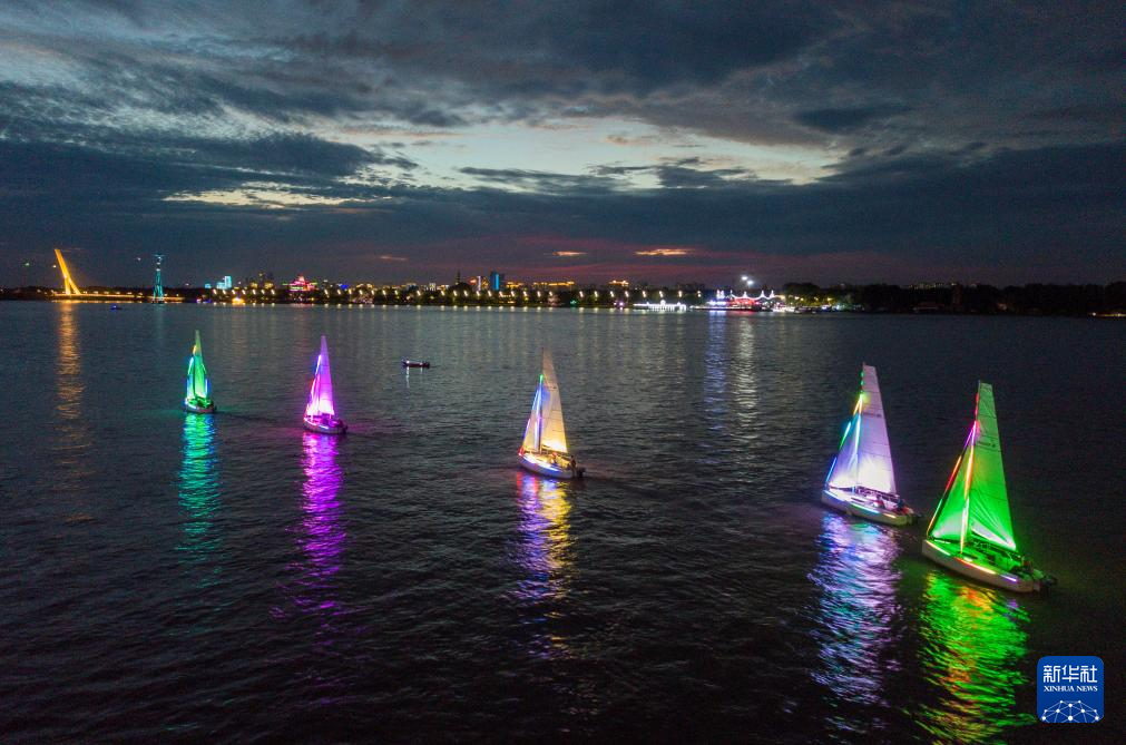 8月14日,松花江哈尔滨段上演帆船灯光秀(无人机照片)。