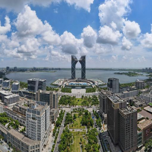 拼版照片:空中俯瞰临港中心大厦(上图为2022年2月10日摄,无人机照片 ;下图为2023年8月1日摄,无人机照片)。