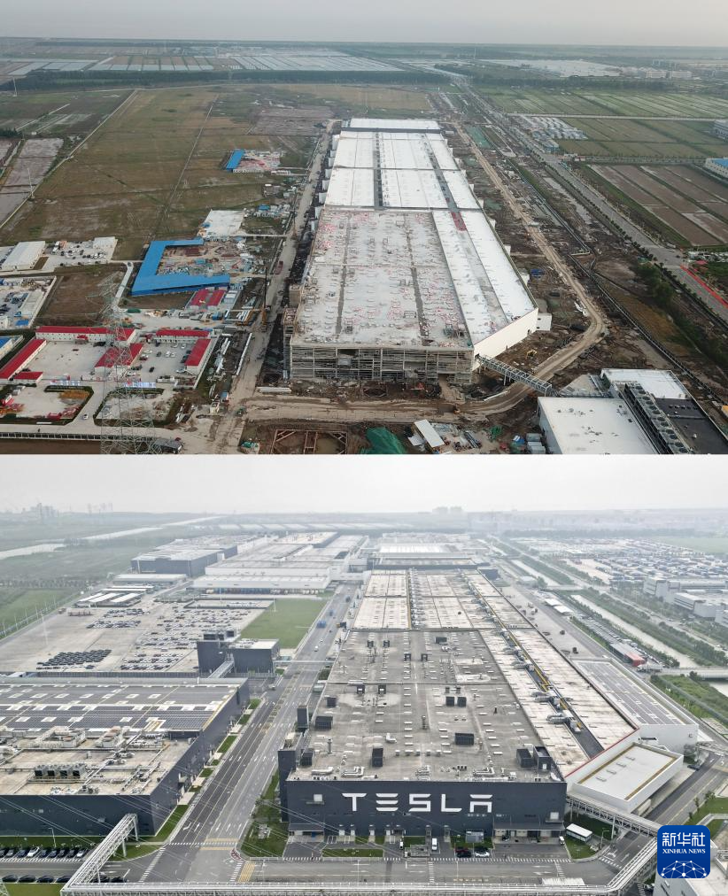 拼版照片:空中俯瞰位于临港新片区的特斯拉超级工厂厂房(上图为2019年6月27日摄,无人机照片;下图为2023年9月26日摄 ,无人机照片)。
