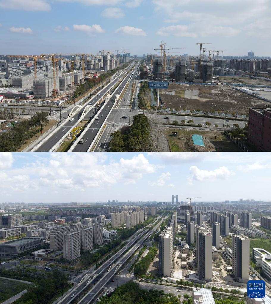 拼版照片:空中俯瞰临港新片区申港大道楼群(上图为2022年2月10日摄,无人机照片;下图为2024年8月14日摄,无人机照片)。