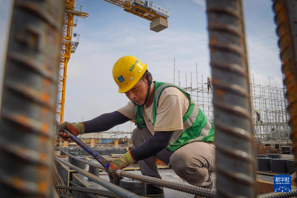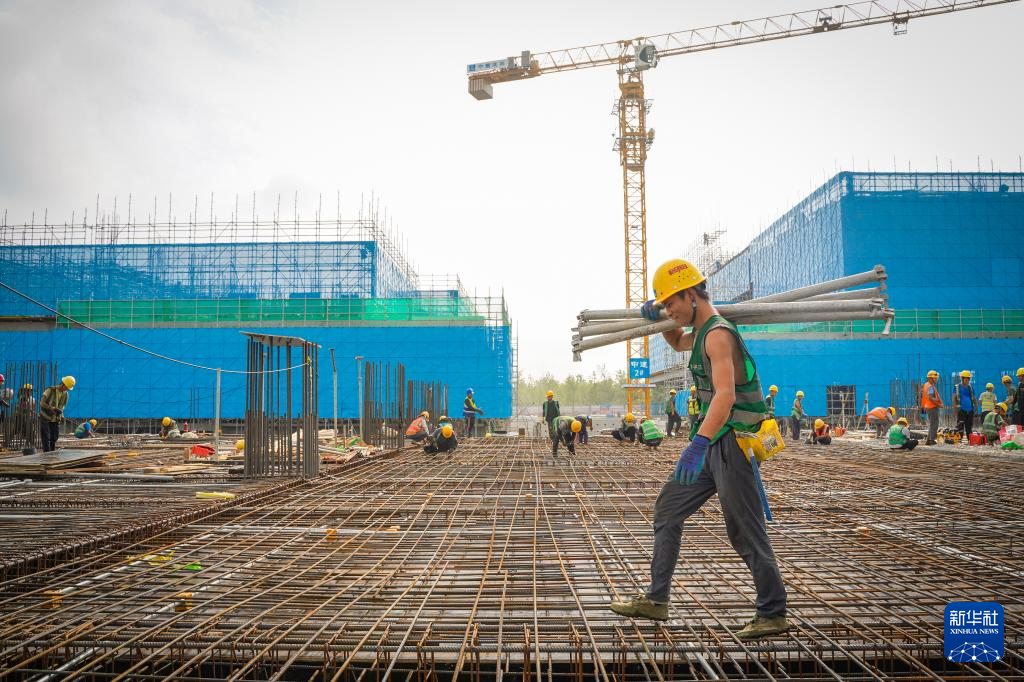 8月21日,中建三局工人在雄安科创中心二期、三期项目建设现场捆绑钢筋。