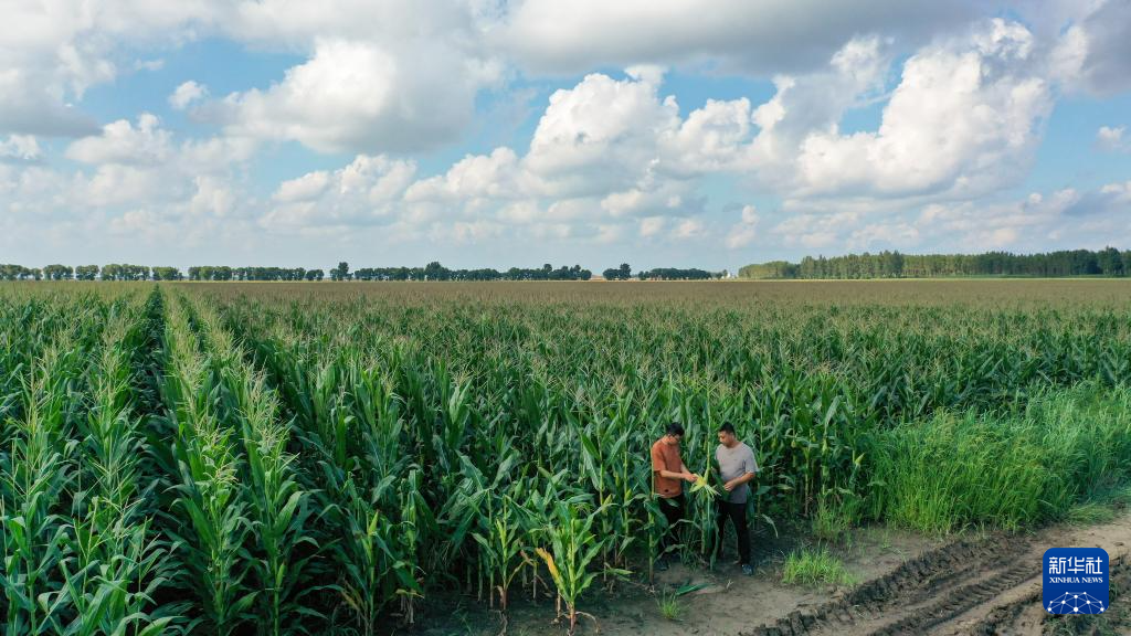 8月8日,在吉林省梨树县孤家子镇两家子村,孤家子镇农业发展服务站高级农艺师兰雨壮(左)与四平市强盛农机农民专业合作社负责人宫雪一起查看玉米长势(无人机照片)。