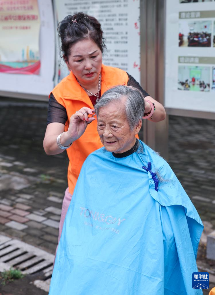 8月21日,在飞英街道的社区“有礼市集”上,志愿者为老人义务理发。