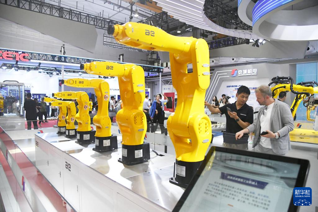 8月21日在2024世界机器人大会现场拍摄的桌面型工业机器人。