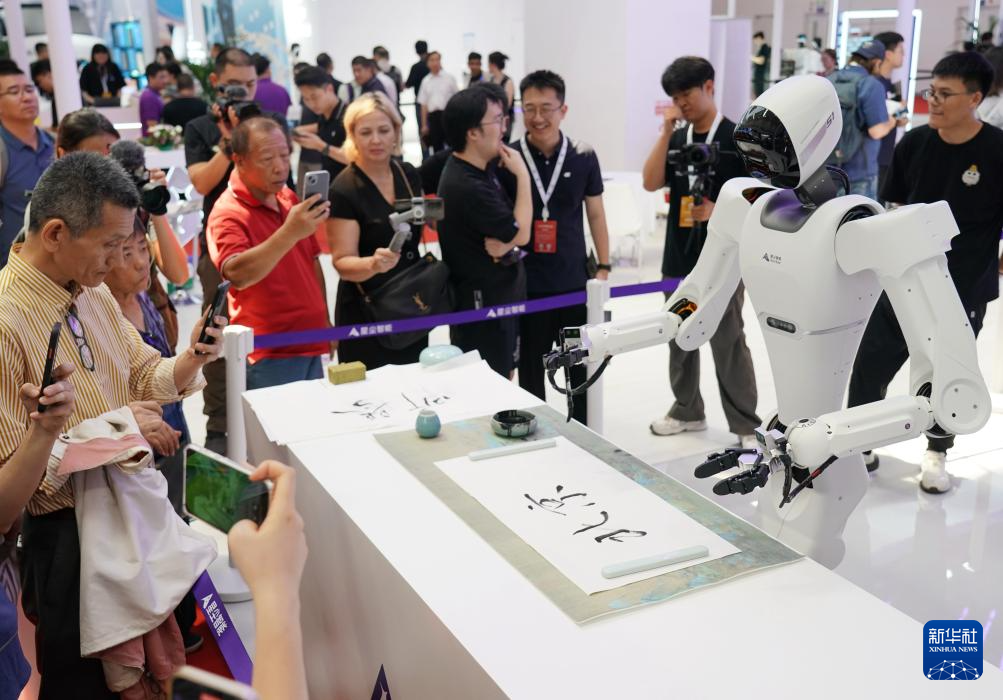 8月21日,观众在2024世界机器人大会现场参观机器人写毛笔字。