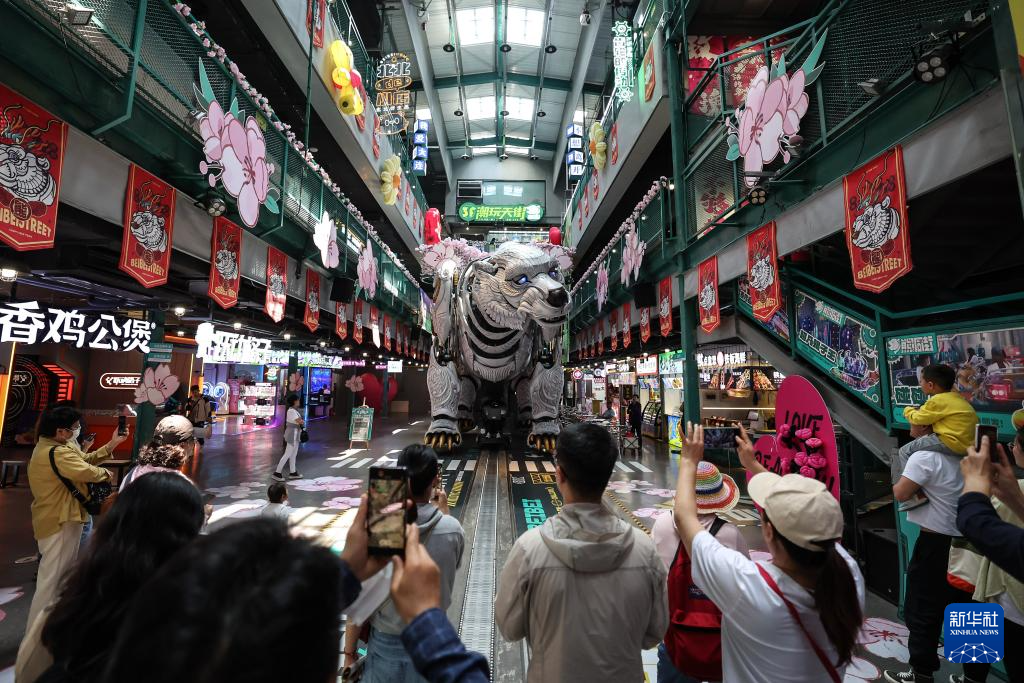 游客在辽宁省大连市熊洞街观看仿生机械巨熊表演(2024年5月22日摄)。