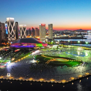 从海上远眺第十五届夏季达沃斯论坛主会场大连国际会议中心(2024年6月16日摄)。