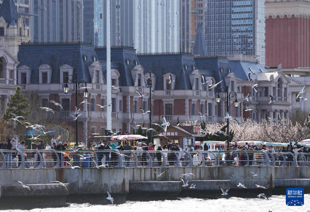 在辽宁省大连市东港商务区,游客在海边休闲观光(2024年4月16日摄)。