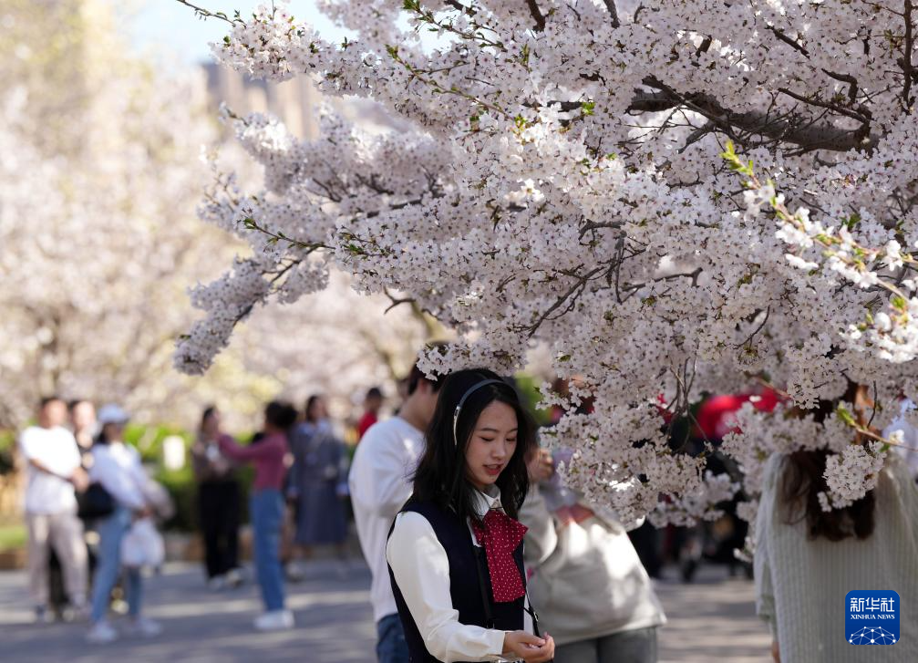 游人在大连龙王塘樱花园内赏花(2024年4月17日摄)。