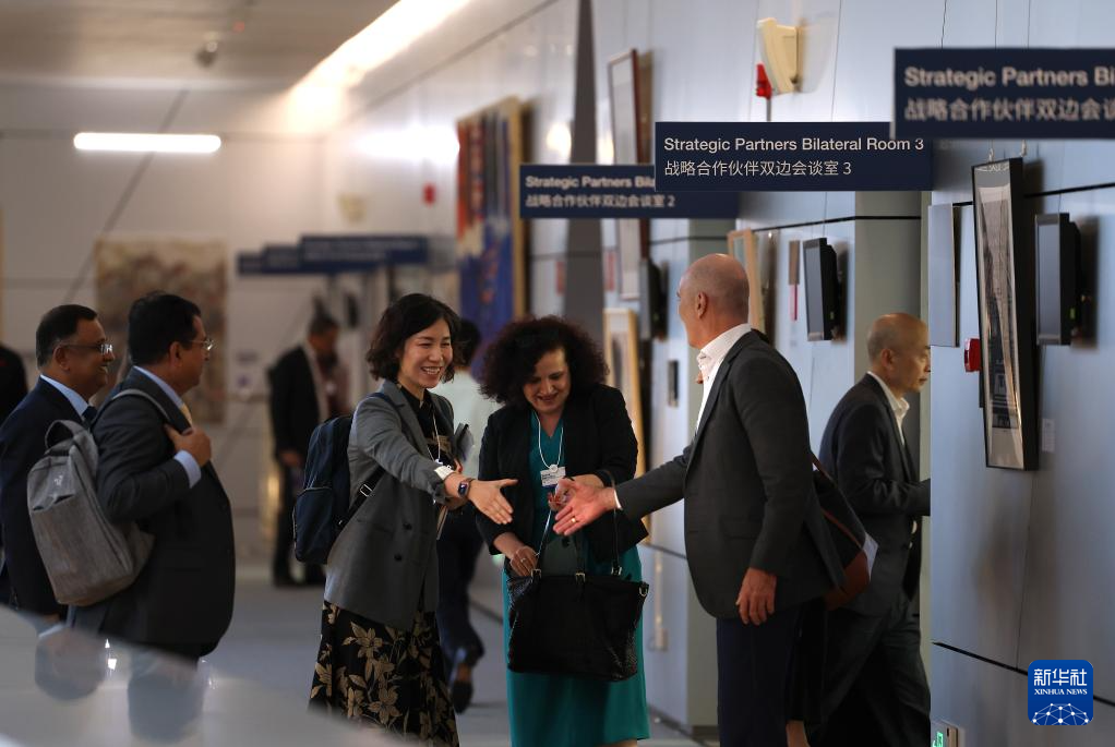 几名嘉宾在夏季达沃斯论坛主会场大连国际会议中心洽谈室外握手(2024年6月26日摄)。