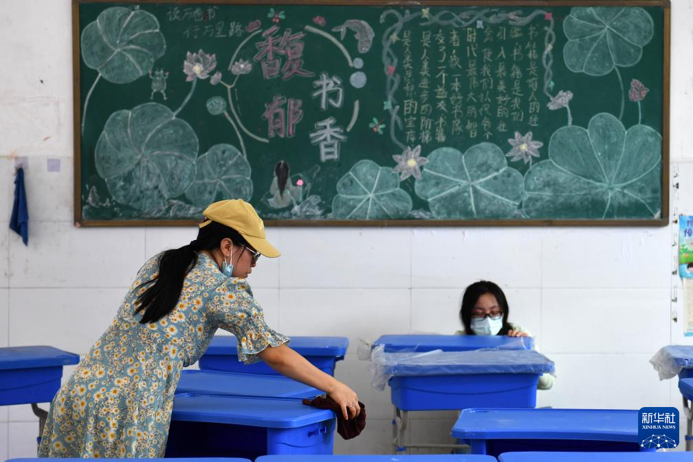 8月23日,教职工在资兴市第二中学整理新课桌。