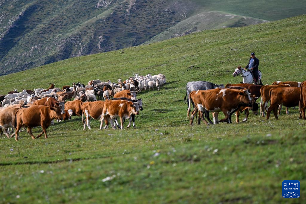 8月22日,在乌兰察布辉腾锡勒草原,牧民赶着牛羊回到放牧点。