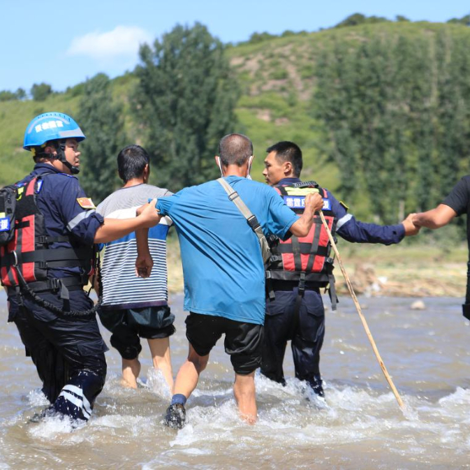8月23日,在葫芦岛市建昌县黑山科乡,救援队员帮助受灾群众渡河后返回。