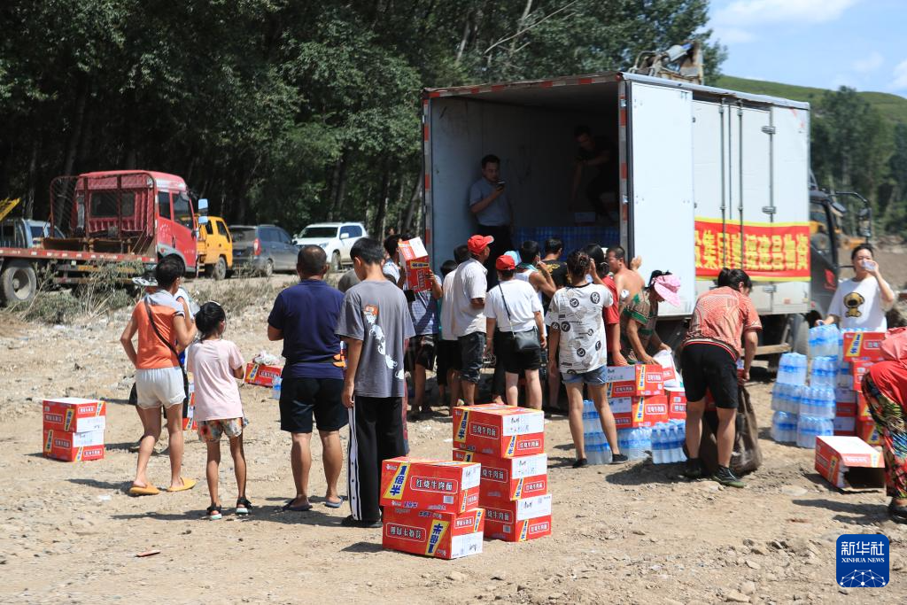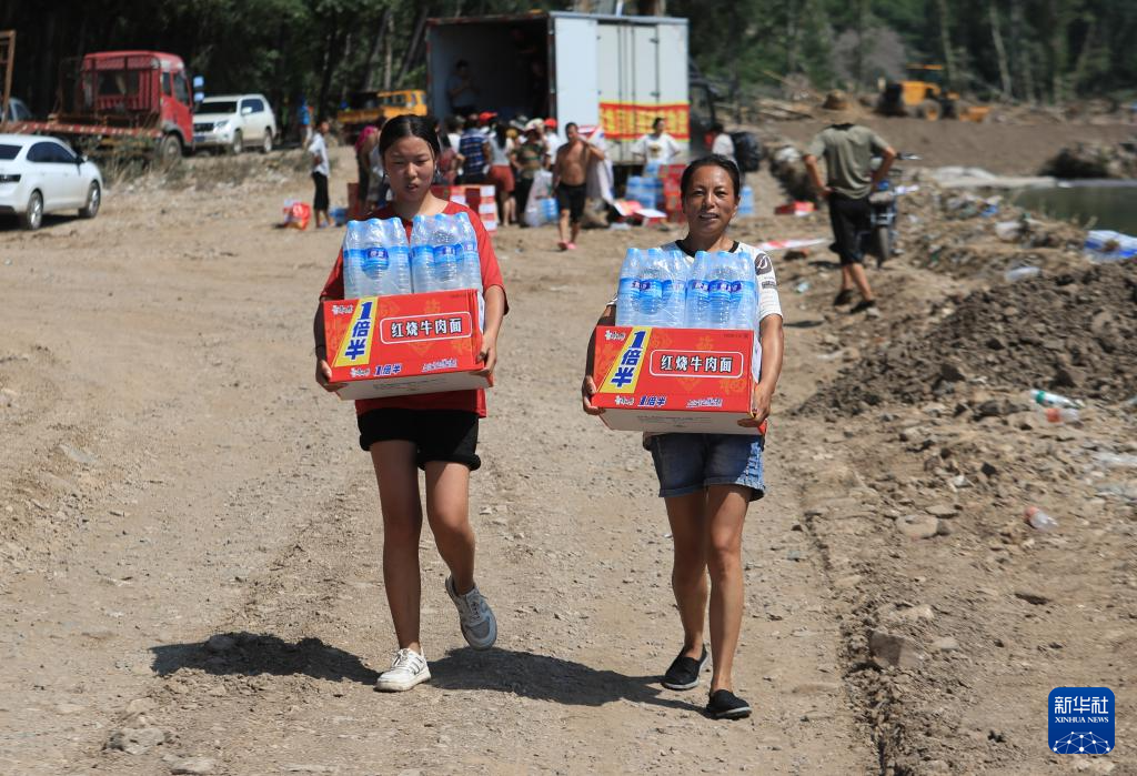 8月23日,在葫芦岛市建昌县黑山科乡,受灾群众在领取救灾物资。