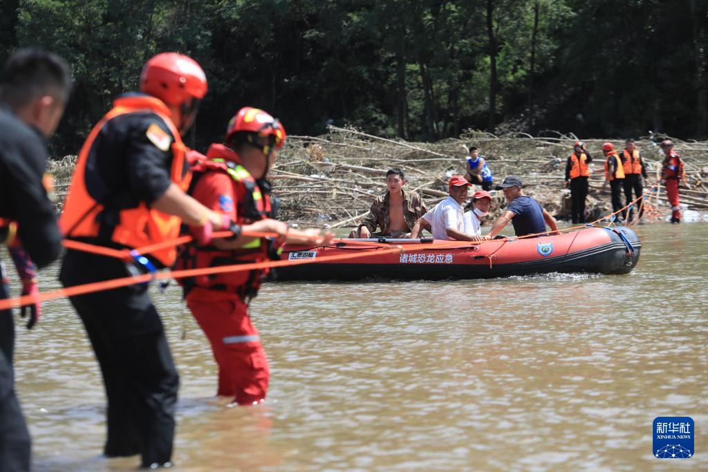 8月23日,在葫芦岛市建昌县黑山科乡,救援队员用橡皮艇帮助受灾群众渡河。