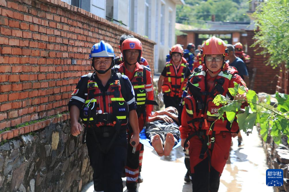 8月23日,在葫芦岛市建昌县黑山科乡二道河子村,救援队员用担架抬出一名急需就医的老人。