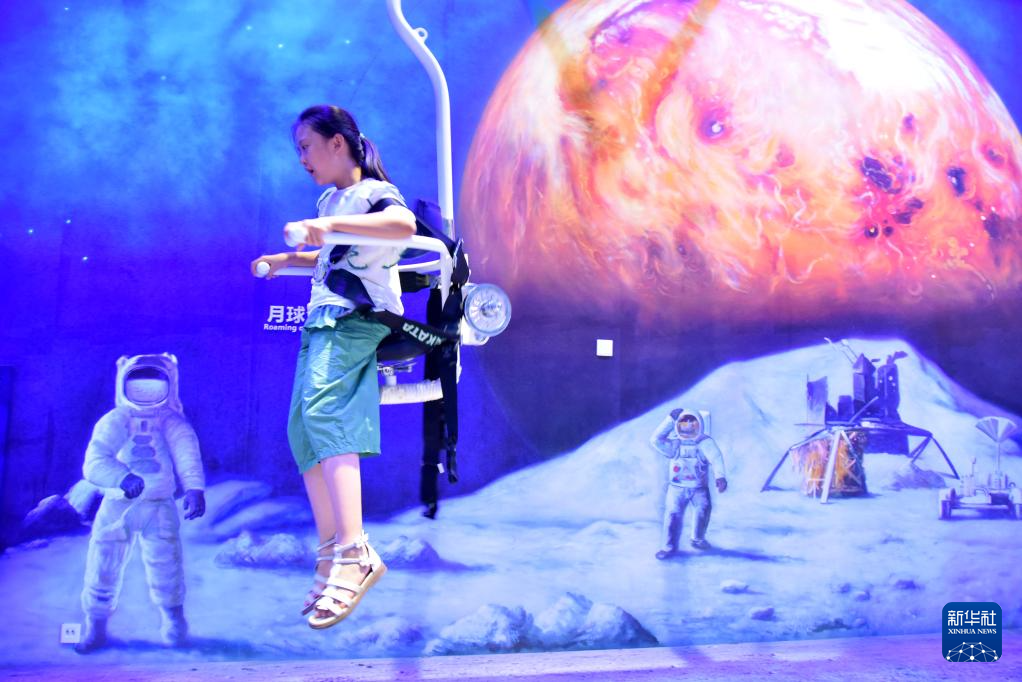 8月24日, 学生在山东省枣庄市科技馆“宇宙探索”厅体验月球漫步。