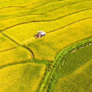 8月24日,在湖南省娄底市双峰县井字镇铜梁村,农民驾驶农机收割中稻(无人机照片)。