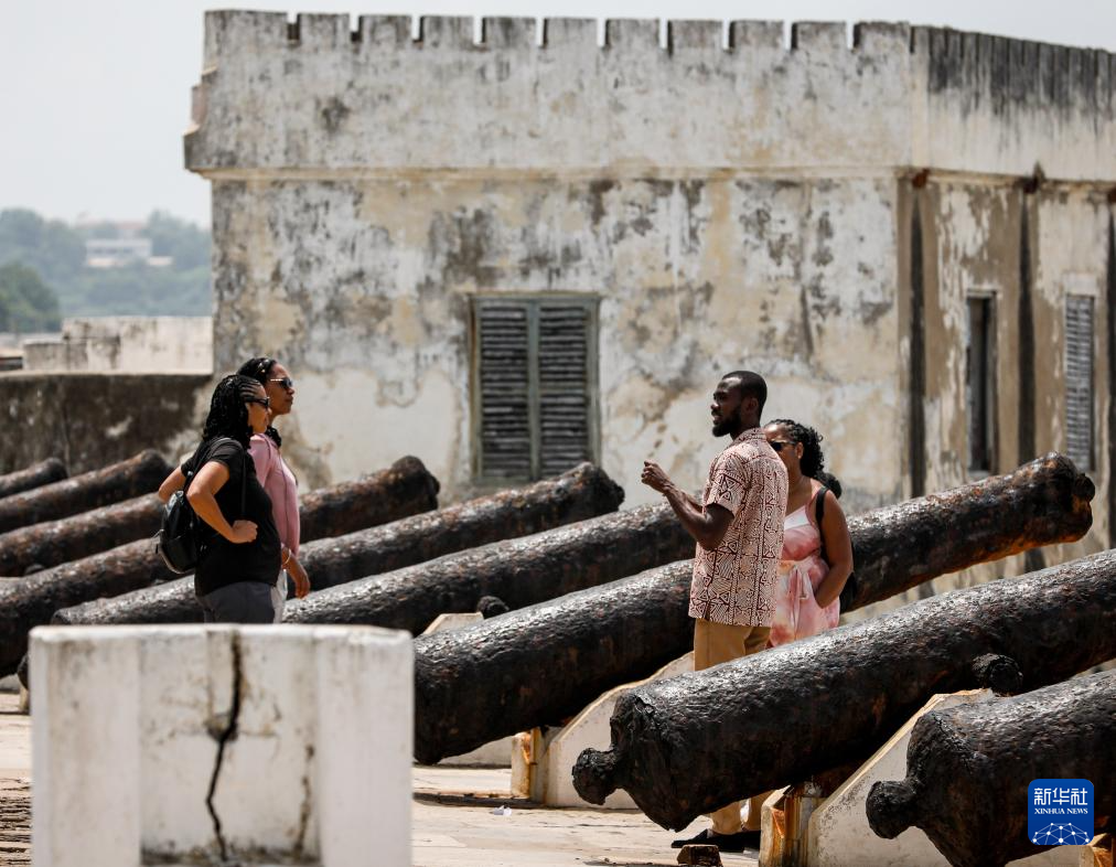 6月19日,在加纳海岸角奴隶堡,一名导游为游客讲解城堡历史。