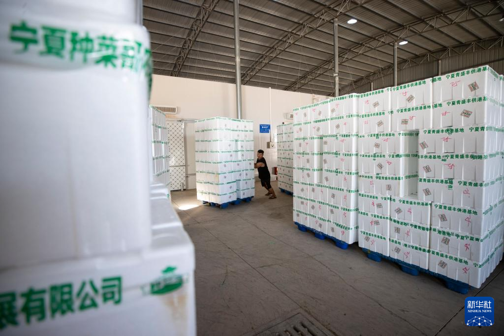 8月23日,在位于宁夏青铜峡市瞿靖镇光辉村的瞿靖镇农产品仓贮冷链集散中心,工作人员准备将打包好的蔬菜装车。