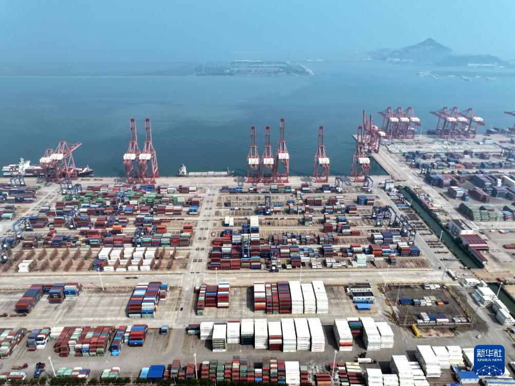 8月24日,在江苏省连云港港集装箱码头,货轮正在装卸集装箱(无人机照片)。