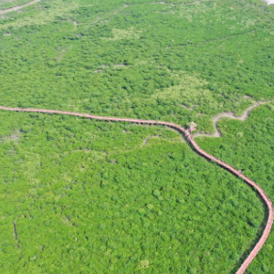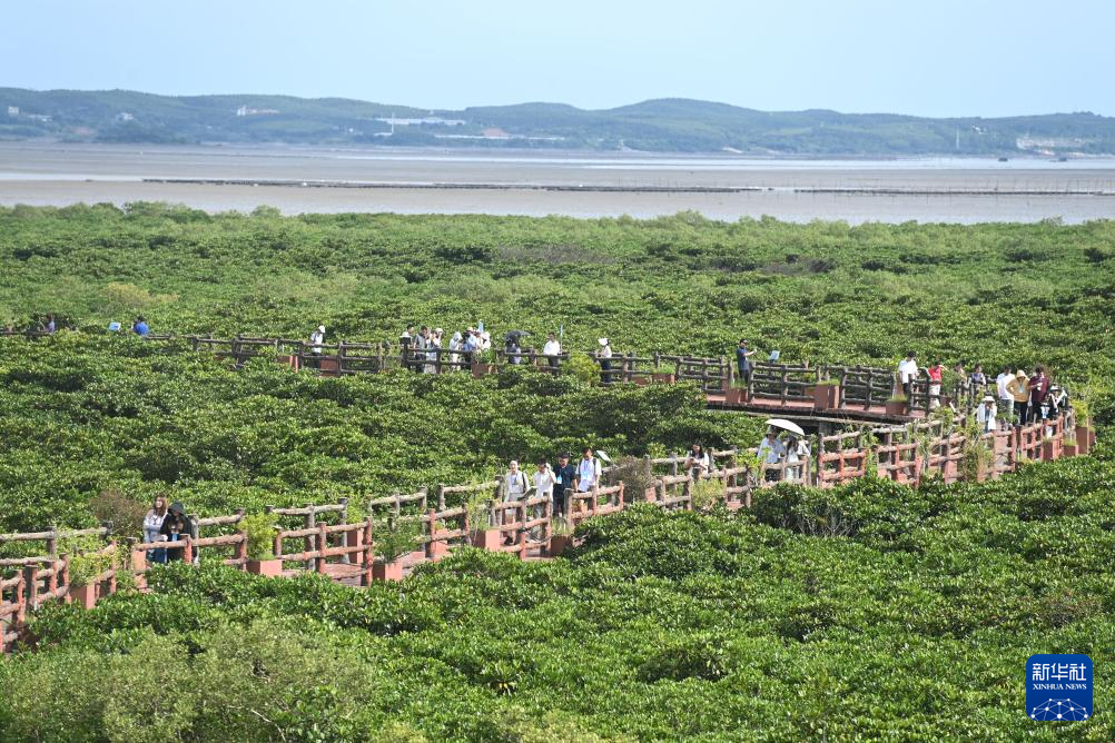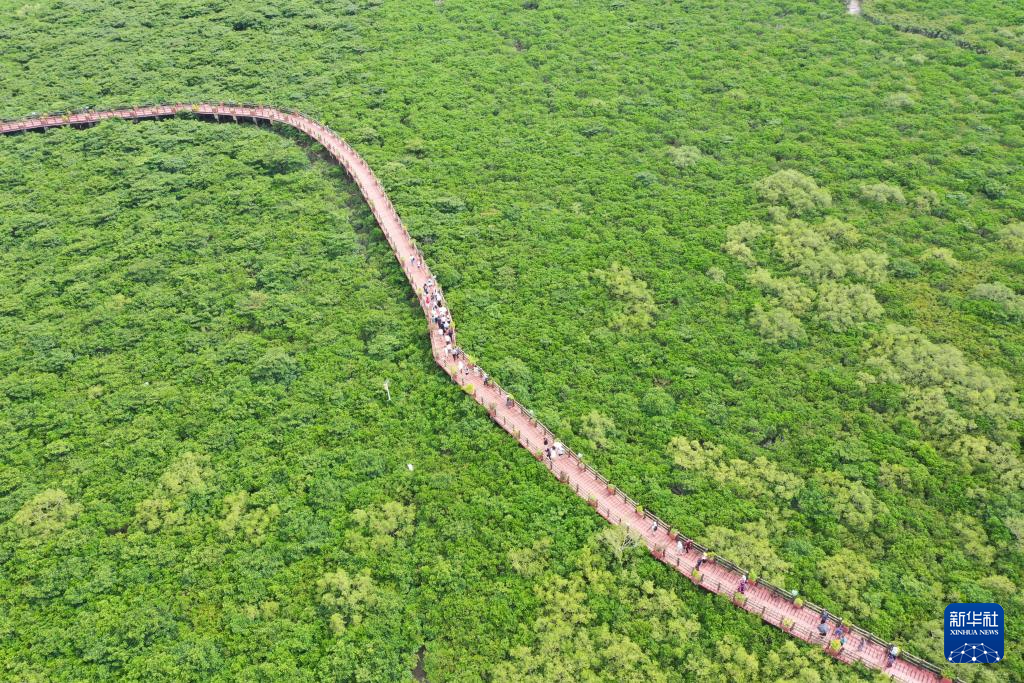8月24日,人们在广西北仑河口国家级自然保护区红树林区内参观。