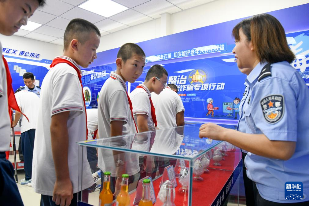 8月26日,乌鲁木齐市公安局水磨沟区分局治安管理大队联合南湖北路派出所开展禁毒宣传教育活动,民警在活动现场向乌鲁木齐市第七十六小学学生讲解禁毒知识。