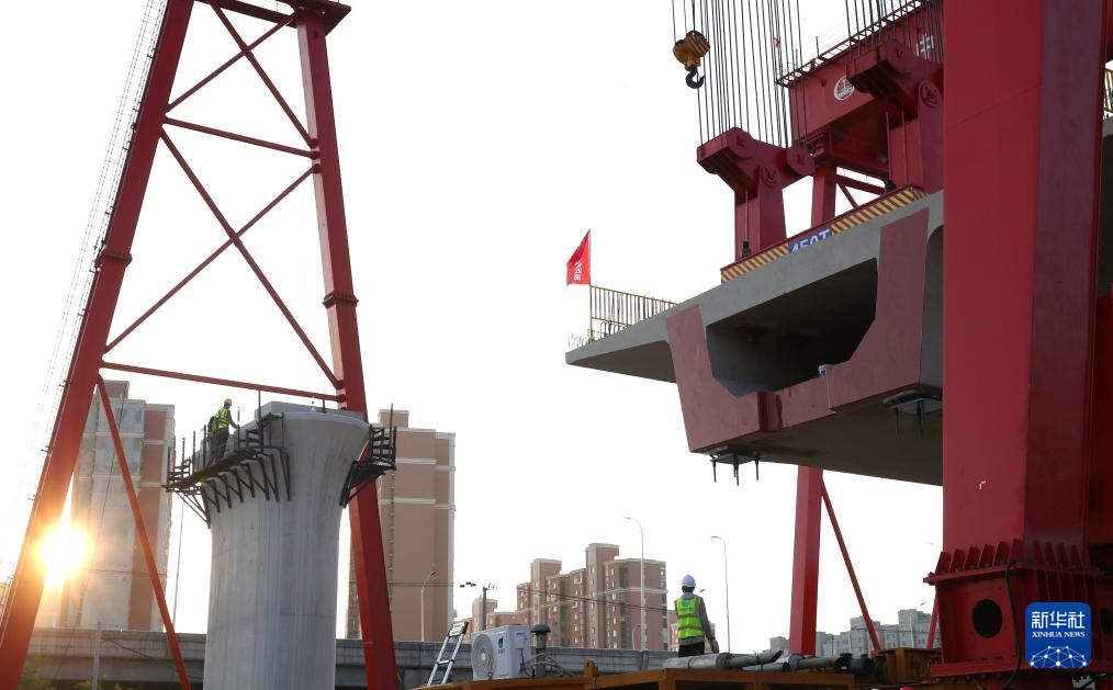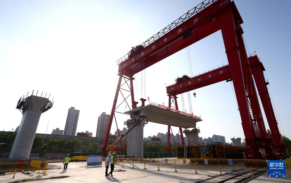 8月26日拍摄的沪渝蓉高铁上海段首榀箱梁架设施工现场。