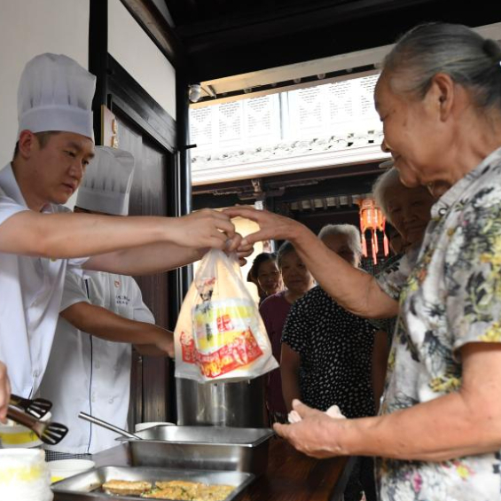 8月27日,在越都社区居家养老服务照料中心,孔乙己酒家的志愿者给来老年食堂用餐的居民发放“爱心餐”。